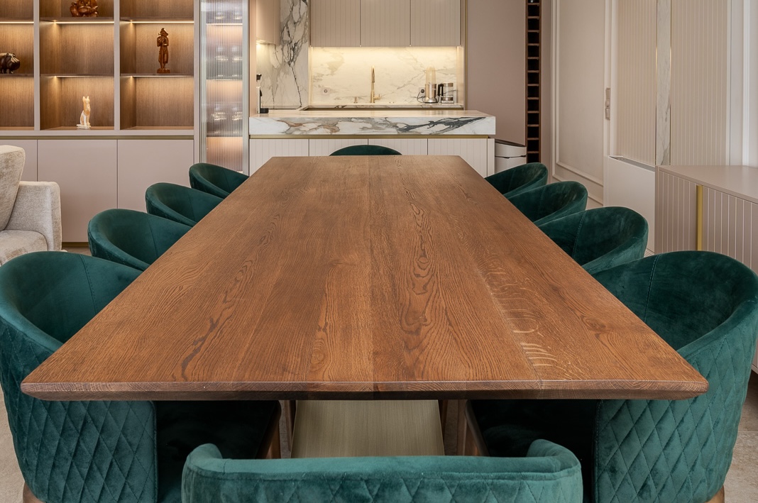 Трапезарна маса с избор на плот от масивен дъб, американски орех, фурнирован МДФ Дъб или Орех, Гол МДФ в цвят по RAL. Kрак изработен от стоманен лист с избор на цветове по каталог. Финишът на плота (окрайчен 90 градуса, неокрайчен или скосен 45 градуса ), изпълнява се в натурален цвят или с тониране с БИО масла.