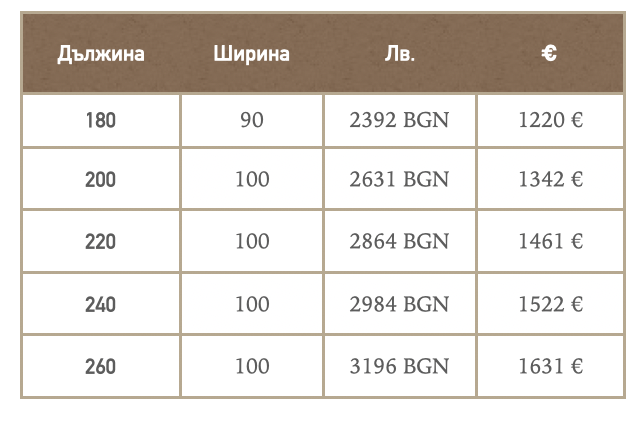 Трапезарна маса с плот от масивен дъб или американски орех, слепени цели ламели с дебелина 4 см, МДФ фурнирован Дън/Орех или Гол МДФ в цвят по RAL . Kрак изработен от стоманен лист , цветове на по RAL . Финишът на плота (окрайчен 90 градуса, неокрайчен или скосен 45 градуса), изпълнява се в натурален цвят или с тониране с БИО масла. Размери по избор (подходящ за маси от 180 см. до 260 см.), опция за разтягане